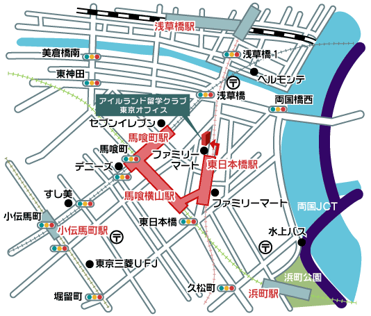 「東日本橋駅」B4出口を出てそのまま清杉通りに沿って1分ほど歩くとファミリーマートがあります。アイルランド留学クラブ東京オフィスはファミリーマートから2軒目のビル(右の写真)の11階です。
