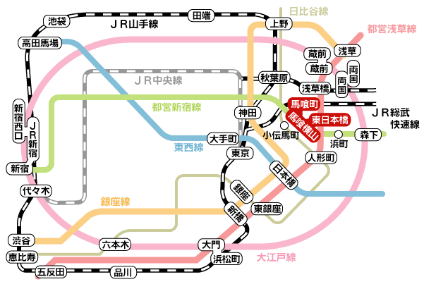 地下鉄浅草線「東日本橋駅」、地下鉄新宿線「馬喰横山駅」、総武快速線「馬喰町駅」の3駅は